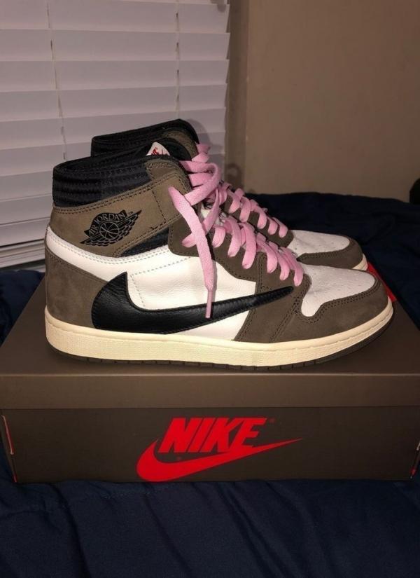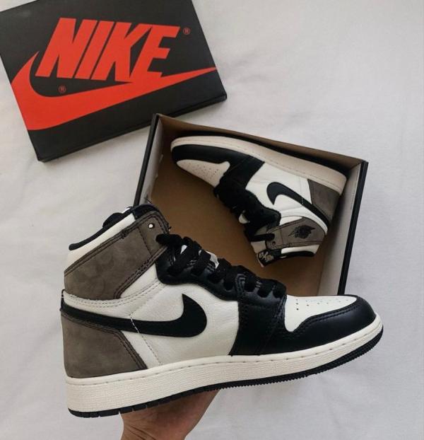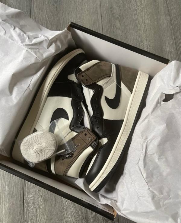 The Air Jordan 1 Retro High OG 'Dark Mocha' features a distinctive palette that calls to mind Travis Scott's highly coveted Air Jordan 1 collaboration from 2019. The upper features an off-white leather base with contrasting black leather overlays on the eyestay and toe. Brown nubuck is utilized on the heel overlay and collar flap, accented with a classic Wings logo on the lateral side. A leather tag with Nike Air branding adorns the nylon tongue.